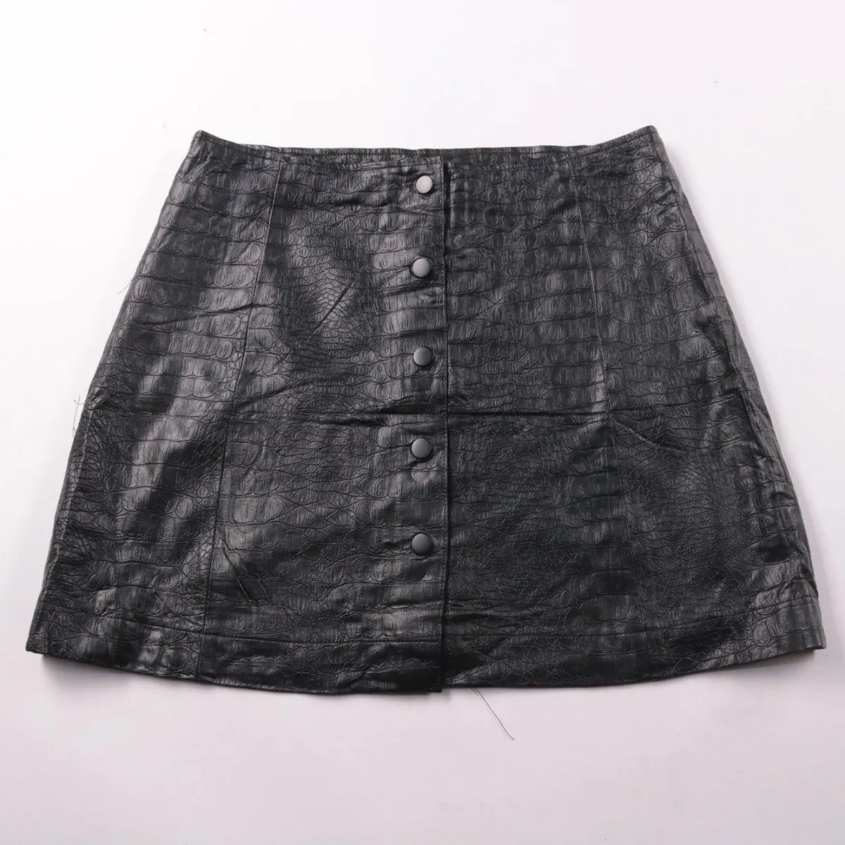 Женская юбка Jennyfer мини из экокожи с тиснением под крокодила и застёжкой на кнопки спереди. Подойдёт для повседневных образов в демисезон и прохладное лето. Материал практичный — легко протирается и не требует сложного ухода.